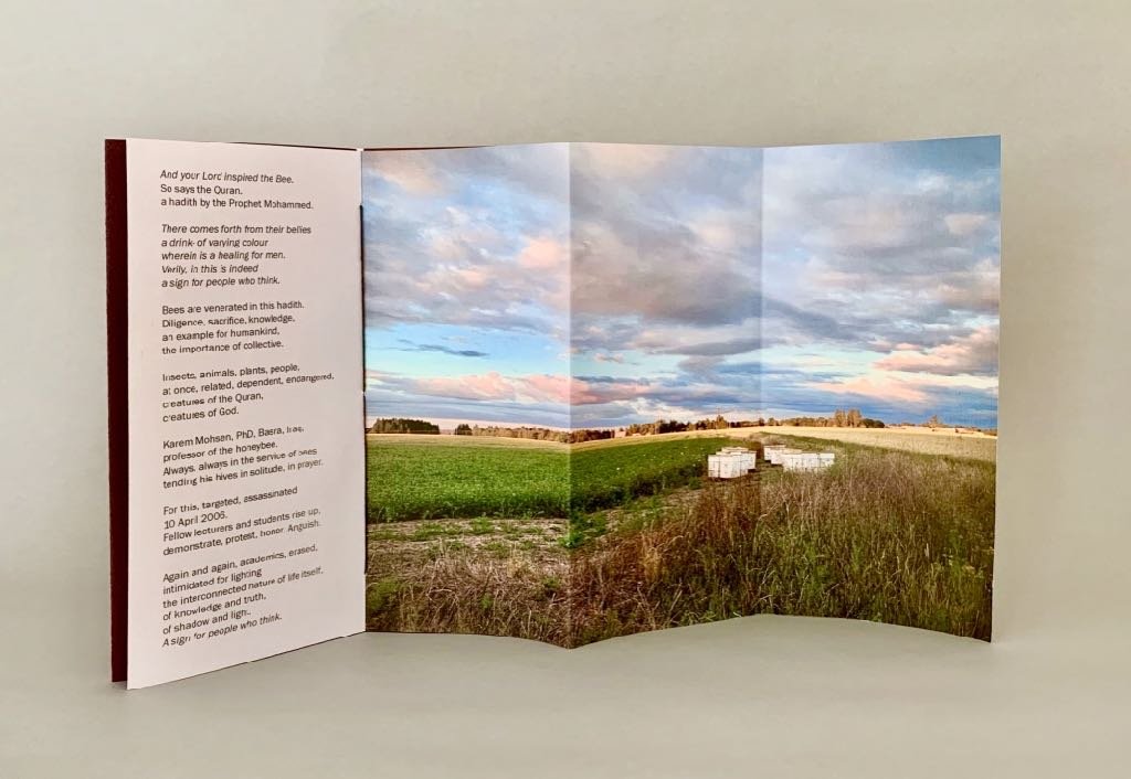Book One of my Show & Tell Chapbook Series was created for the Shadow and Light photography project curated by Beau Beausoleil, a project of the Al-Mutanabbi Street Starts Here Coalition. This book honors Karem Mohsen, PhD lecturer at the Department of Agriculture, College of Agronomy, Basra University, Iraq. Beau told me that Dr. Mohsen was killed on 10 April 2006. He worked in the field of honeybee production. Lecturers and students called for a demonstration to protest his assassination. [Source: al-Basrah, April 11, 2006]