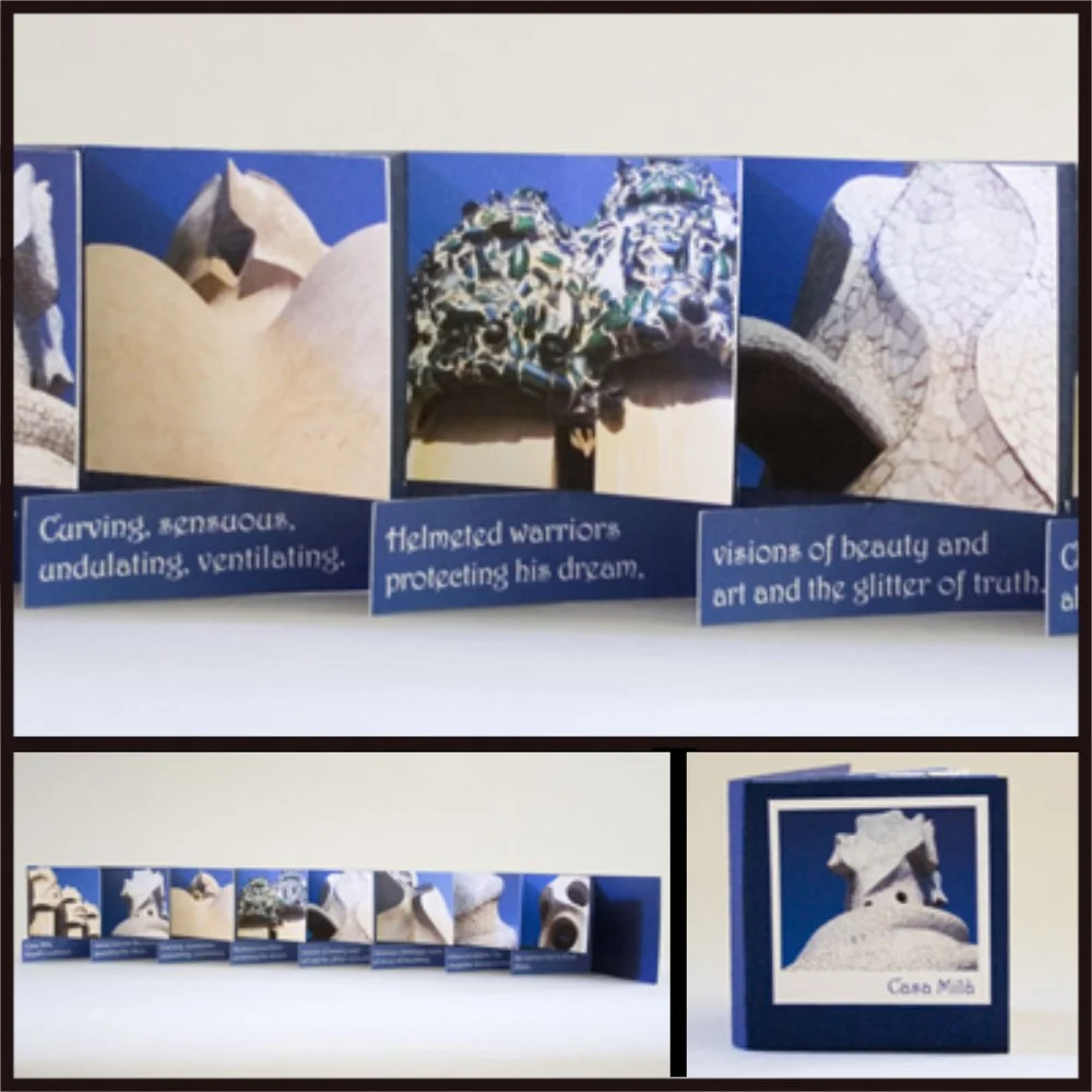This book is a “miniature book” created using Hedi Kyle’s flag book structure. I like to think that as you open the book the sentinels dance across the sky just as they do in my dreams of Barcelona.